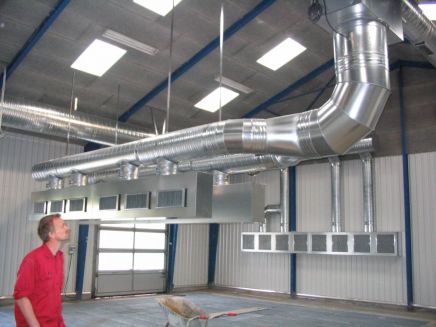 Kombiaggregat type CA x bv med en norminel kapacitet på 18.000 m3/h. For indblæsning og opvarmning af erstatningsluft. Indbygget varmeflade, dobbelt kryds, udsugningsventilator, samt by-pass spjæld for afkøling af hallen i det omfang luften udenfor er koldere end den luft som er i bygningen.